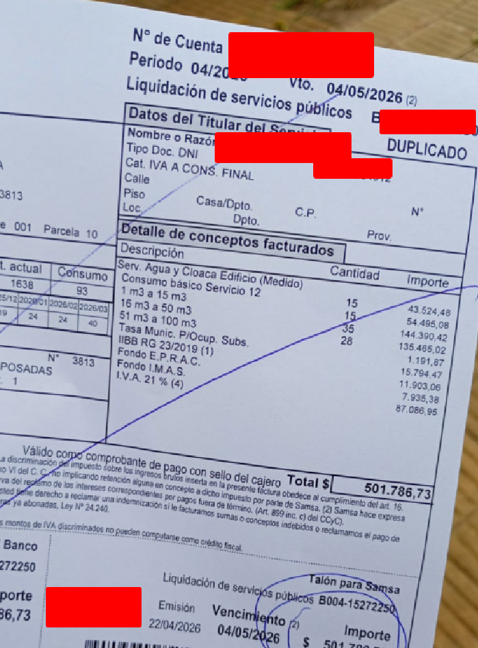 Esto ultimo lo decimos en vista de lo que viene sucediendo hace años, pero quizás, debido a la crisis económica actual, toma mas fuerza en las facturaciones de los últimos meses. El misionero promedio, que en medio de la noche se desvela, se hace un mate, saca las facturas, las pone sobre la mesa, compara con las de meses anteriores, suma, resta, hace cuentas en un cuadernito... y siente esa sensación de agobio en el pecho y en su fuero interior, al mirar la factura de SAMSA, que presenta consumos irrisorios (60, 80, 100 m3, es decir, 60 mil, 80 mil, 100 mil litros por mes) piensa lo siguiente: