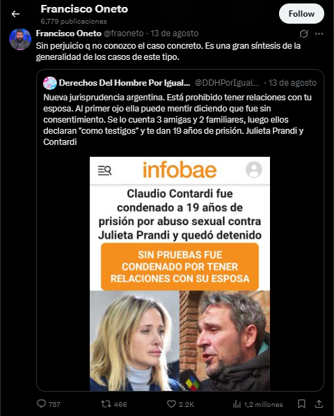 Además, en su cuenta de X, sus publicaciones fueron calificadas como violentas y extremas por seguidores y periodistas. Postea a menudo contra los derechos de las mujeres y el colectivo LGTBIQ+, frases como “los homosexuales deben ser curados”. Hace pocos días, salió a bancar a Claudio Contardi, quien fue condenado a 19 años de prisión por violación contra Julieta Prandi. El letrado publicó un polémico tuit en una cuenta llamada “Derechos Del Hombre Por Igualdad” el cual fue ampliamente repudiado.