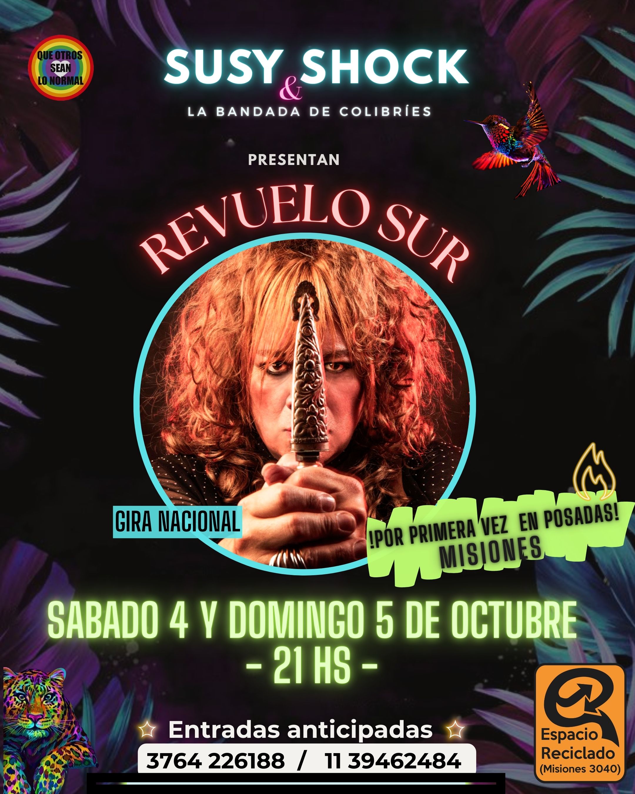 Susy Shock es poeta, cantante, actriz y referente de la cultura trava en Argentina. Desde Buenos Aires, llega por primera vez a Posadas con su banda La Bandada de Colibríes para compartir el repertorio de Revuelo Sur, un disco que recorre tangos, valses, milongas, candombes y marchas camión.