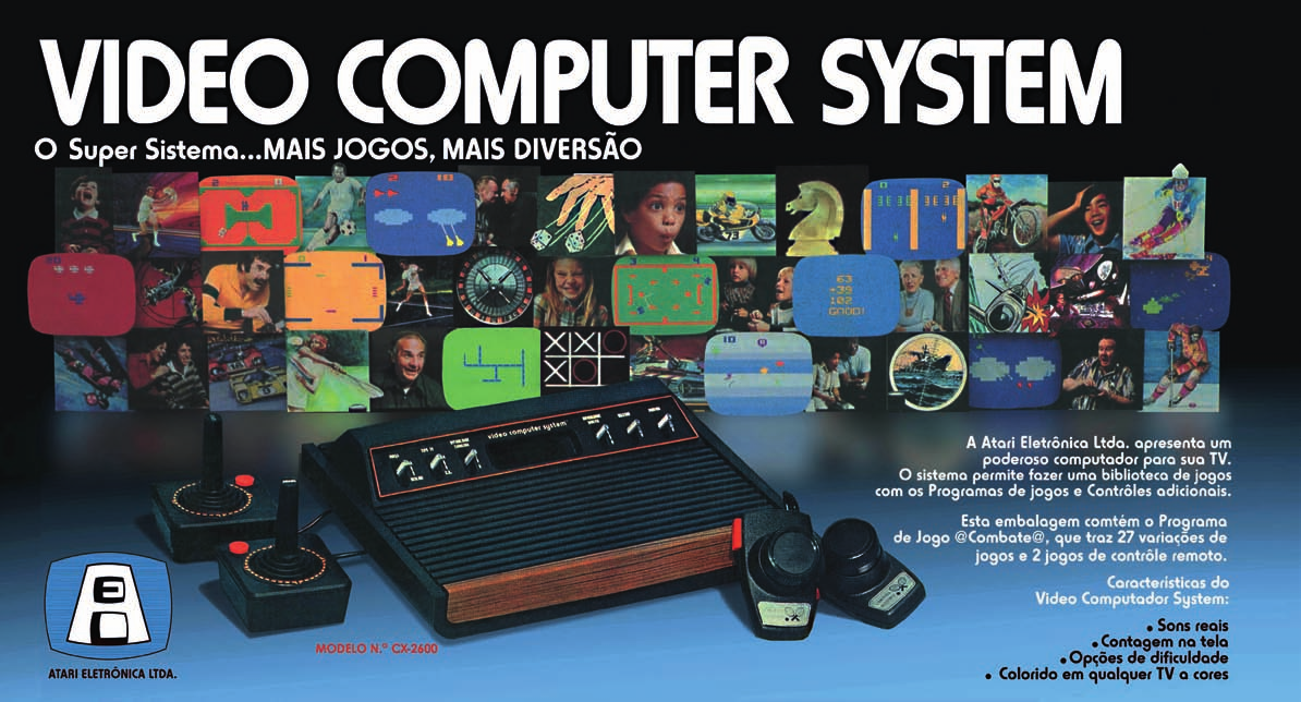 La Atari VCS, posteriormente Atari 2600, salió en 1977, cuando en Brasil comenzaba el auge de las consolas Pong. Algunos brasileños que viajaban también comenzaron a tomar contacto con esas máquinas y traerlas de contrabando. Primero se las trajo de EE. UU. totalmente de queruza y luego fueron adquiridas del mismo modo en Paraguay. Nolan Bushnell le comenta a Marcus en su documental que sabía del contrabando: “Atari siempre quiso ser una empresa global. Enviamos tantos cartuchos a Panamá que, para que todos se vendieran, deberían haber sido comidos con el desayuno de cada panameño. Sabíamos que existía un mercado negro, un mercado pirata a causa de las regulaciones de las importaciones en América del Sur”. De esta manera, las primeras Atari entraron a fines de los 70 y para esto, los televisores brasileños tuvieron que ser reconvertidos a la norma NTSC estadounidense, si no, todo se veía en blanco y negro.